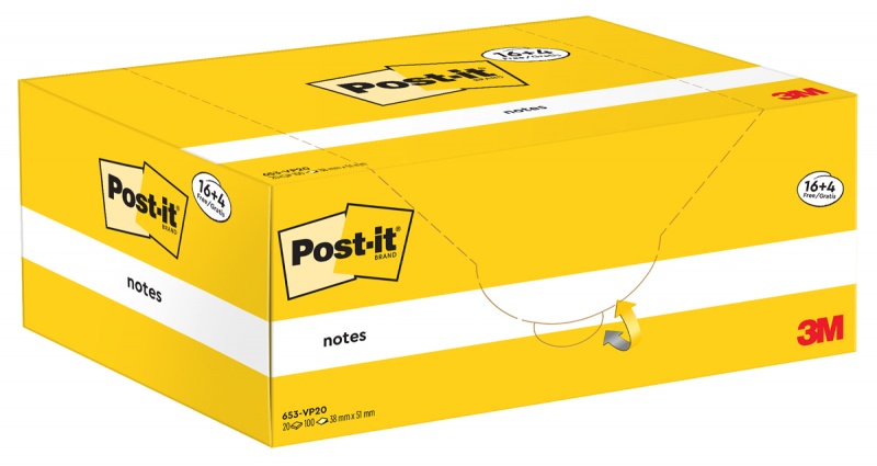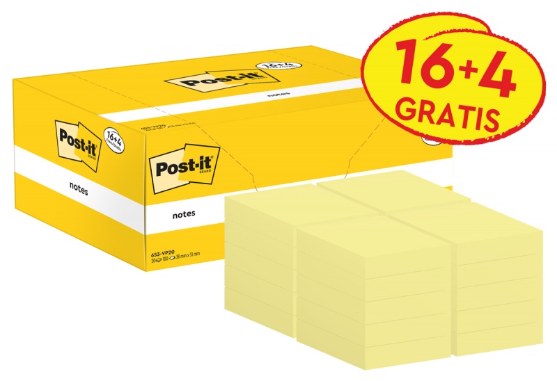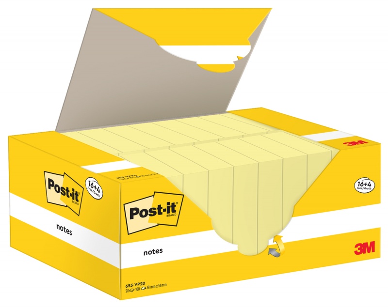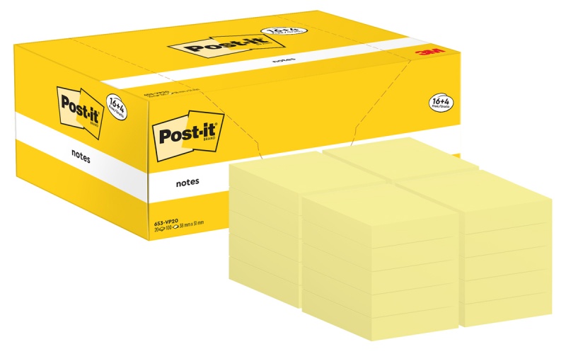 Notes Canary Yellow™ (653CY-VP20), 38x51mm, 100 sheets/pad, 16 + 4 pads FREE, canary yellow